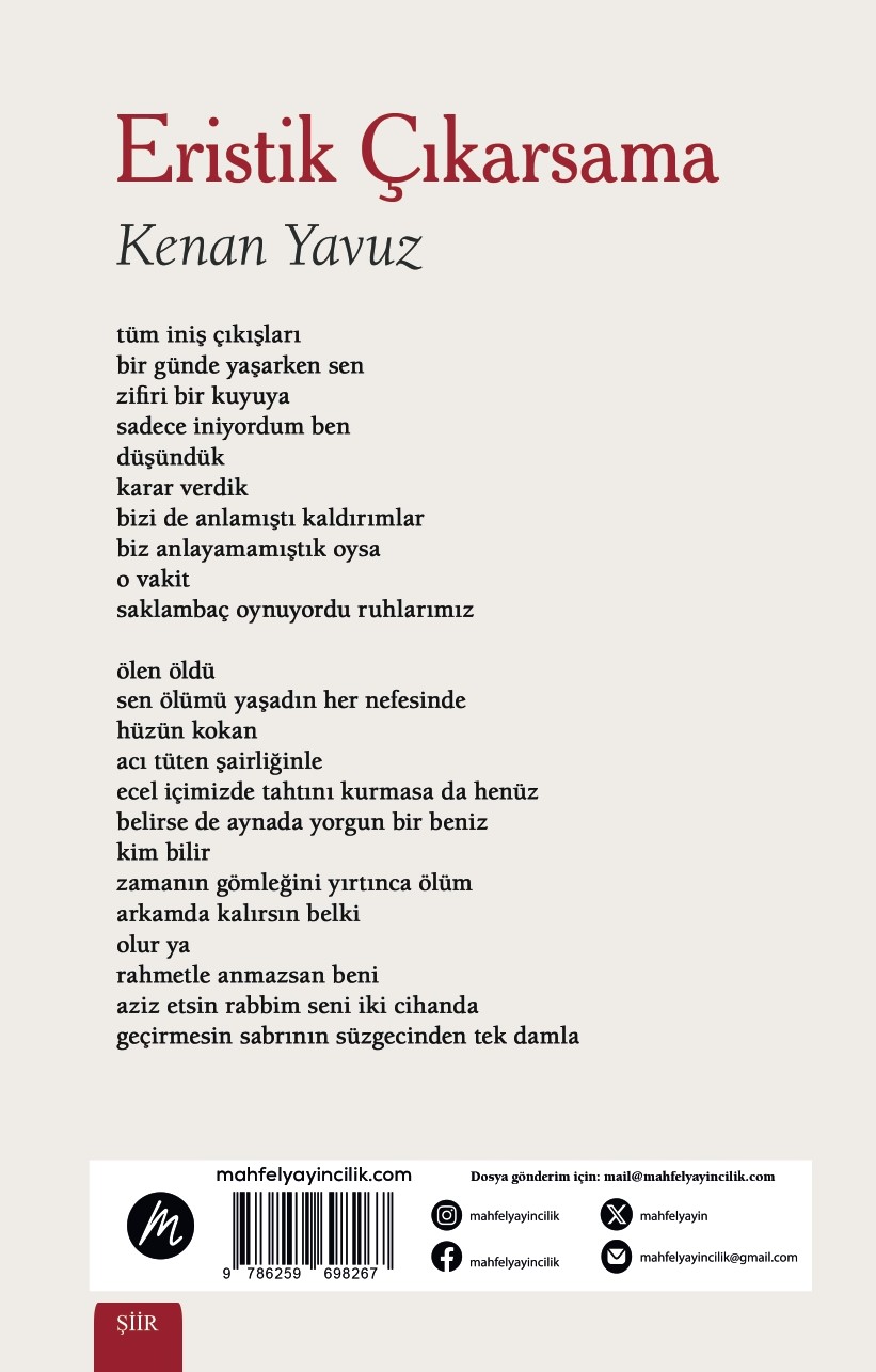 Kenan Yavuz, yazın hayatındaki ilk başarısını 2015 yılında yayımlanan ve Nermin Bezmen’in eserlerini psikanalitik bir çerçevede ele alan inceleme kitabıyla elde etmişti. İkinci kitabı olan “Eristik Çıkarsama” ile bu kez kuramsal metinlerin dışına çıkan Yavuz, “tartışma ve haklı çıkma sanatı” anlamına gelen eristik kavramını şiirsel bir bağlamda yeniden yorumluyor.